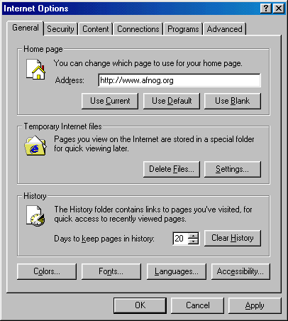 Once finished with this click "OK" until all the Internet Options Control Panel dialogues are closed. Unlike Netscape, you will need to restart MSIE in order for these changes to take affect.