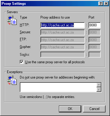 3.) This is what you need to choose. Note, if you have configured your proxy server with an autoconf.pac file, then you can fill in the Automatic proxy configuration box with this information. In the case of our local proxy server named cache.uct.ac.za you would fill in the following: