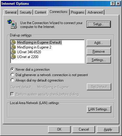 How you do this looks a bit different in Netscape and Microsoft Internet Explore (MSIE)r, and it looks different across versions of Wiindows and your Browser. This document shows you how to do this using Netscape 4.x and IE 5 under Windows 9x/ME/2K/NT.