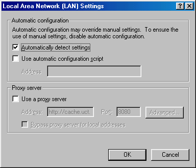 2.) After you click on "LAN Settings..." this is what you will see if you have not configured anything. Note that the greyed out text in the "Proxy server" section would not be present if you have never configured a server. This setting is really quite misleading. What it means is that MSIE 5 is looking for a machine called "wpad.domain" - This can actually cause problems. Please read the accompanying document, "Proxy Servers, Auto Discovery, and IE 5" for complete details about this.