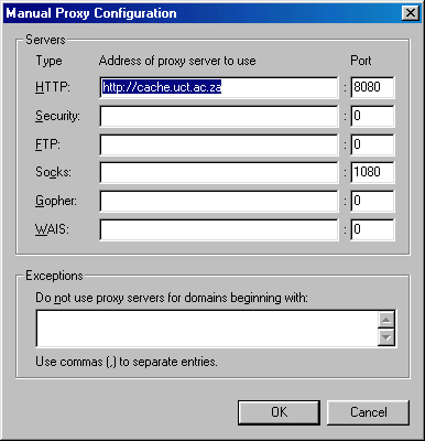 3.) This is what you need to choose. Note, if you have configured your proxy server with an autoconf.pac file, then you can fill in the Automatic proxy configuration box with this information. In the case of our local proxy server named cache.uct.ac.za you would fill in the following: