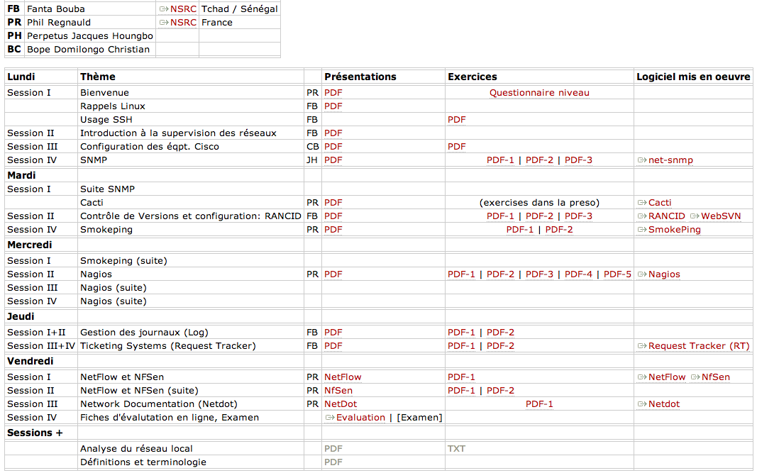 Le public vise c'est les personnes charges de gerer differents types de reseaux et de faire des operations sur les NOCs. Voir l'Agenda pour la liste des sujets abordes. Les travaux pratiques constituent 60% de cet atelier.